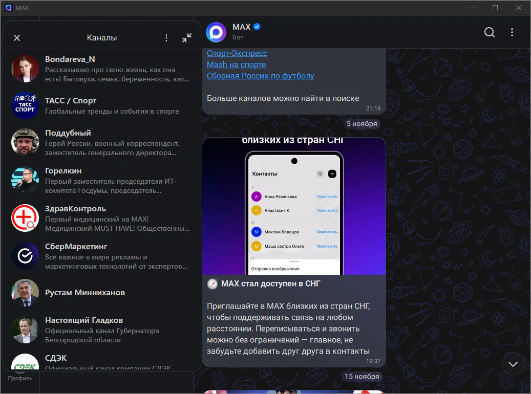 MAX - приложение для общения и решения повседневных задач. Общайтесь в удовольствие благодаря высокому качеству связи и быстрому соединению даже в сетях со слабым сигналом. Анимированные стикеры, реакции в чатах, возможность отправки файлов до 4 ГБ – все необходимое для того, чтобы делиться настроением и важной информацией. В MAX можно войти сразу с нескольких устройств, используя свой основной номер мобильного телефона. Чаты и звонки будут синхронизироваться между устройствами.