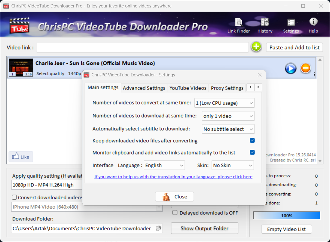 ChrisPC VideoTube Downloader позволяет скачивать видео и плейлисты с YouTube, Dailymotion, BBC iPlayer, ITV Player, Viaplay, ABC, FOX, CBS.com, Vimeo, Prosieben, Metacafe, CBC.ca и многих других видеосайтов. После скачивания видео можно конвертировать в форматы, совместимые с iPad, iPhone, iPod, MPEG-4 H.264, MP3, AC3.